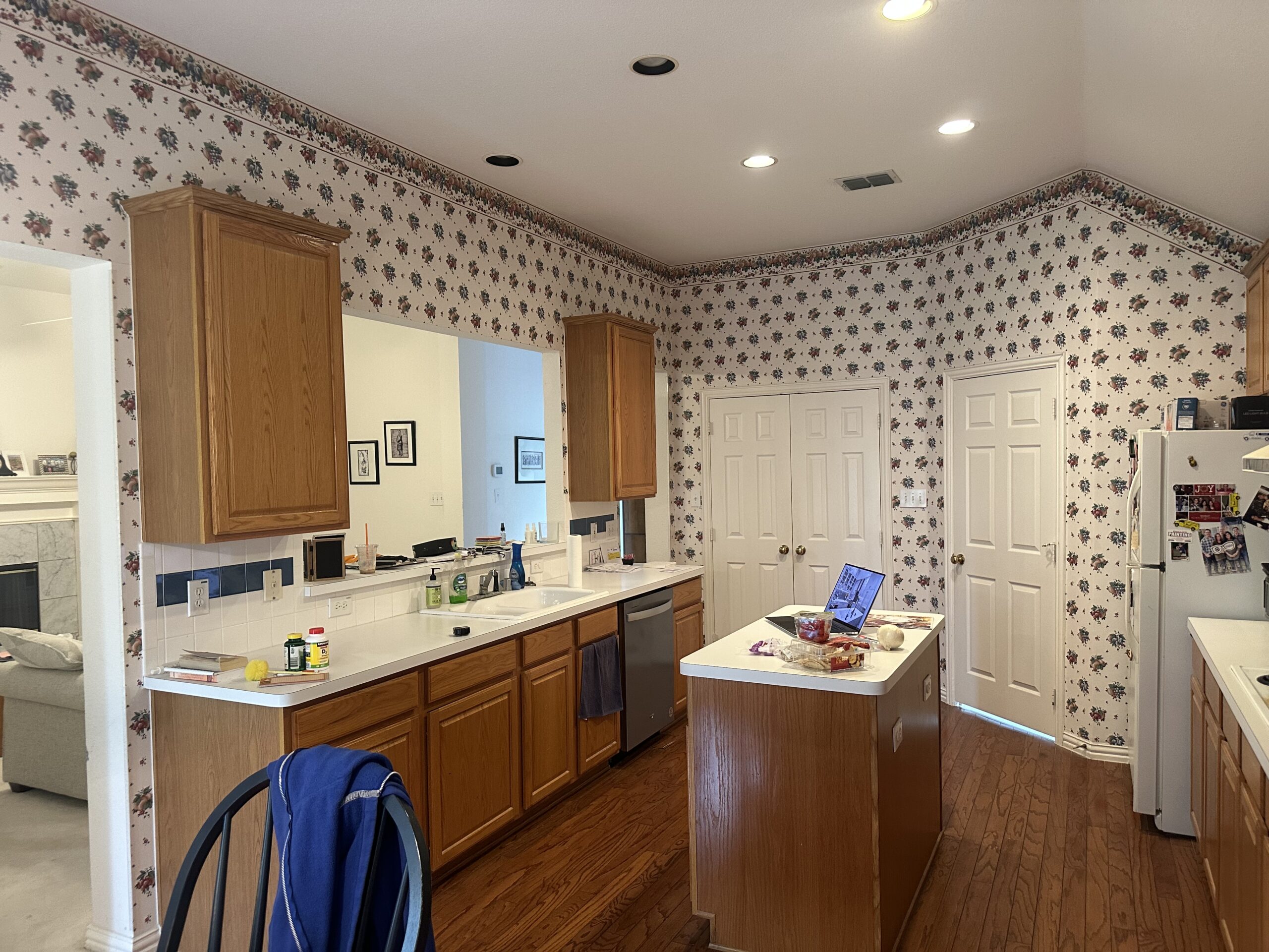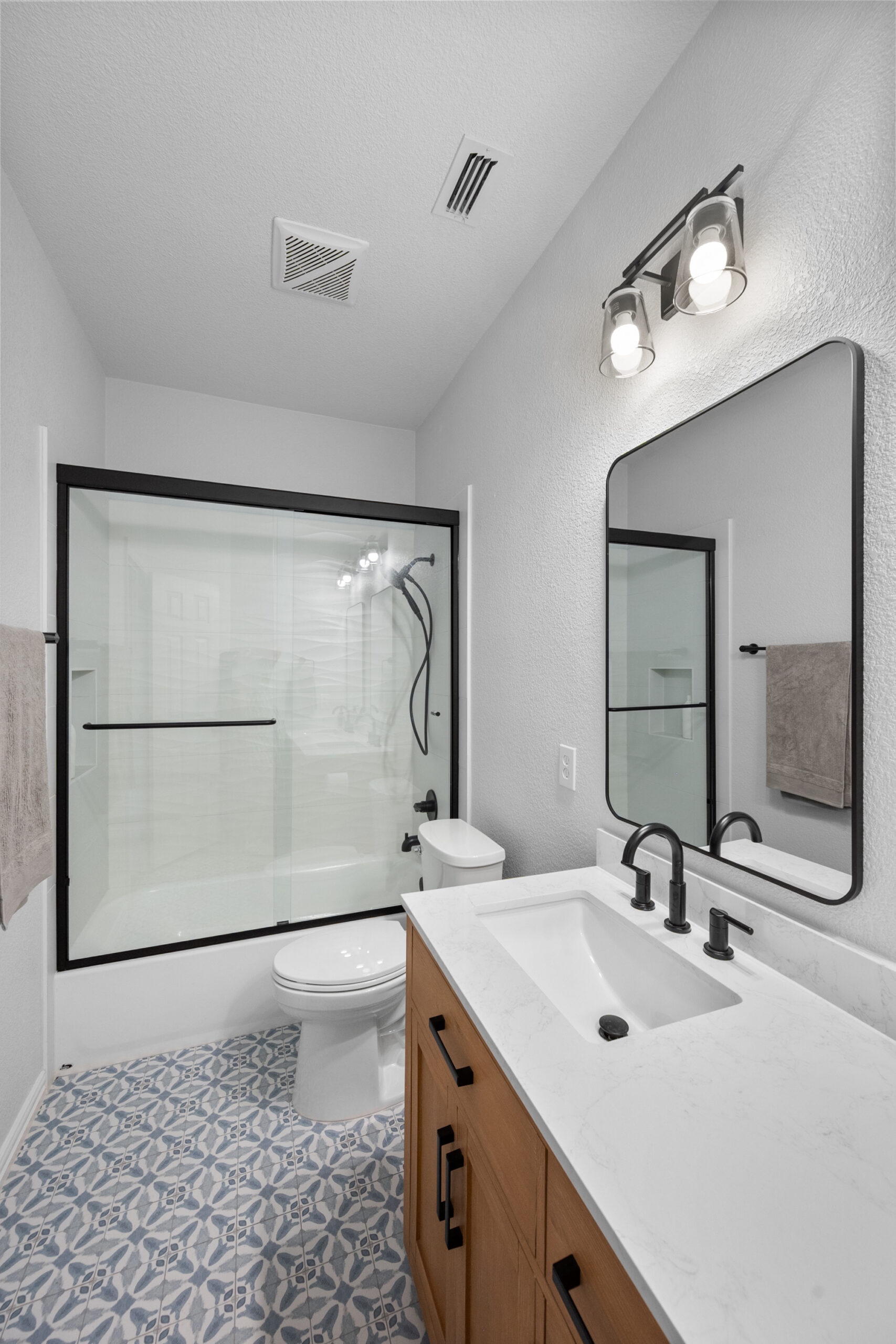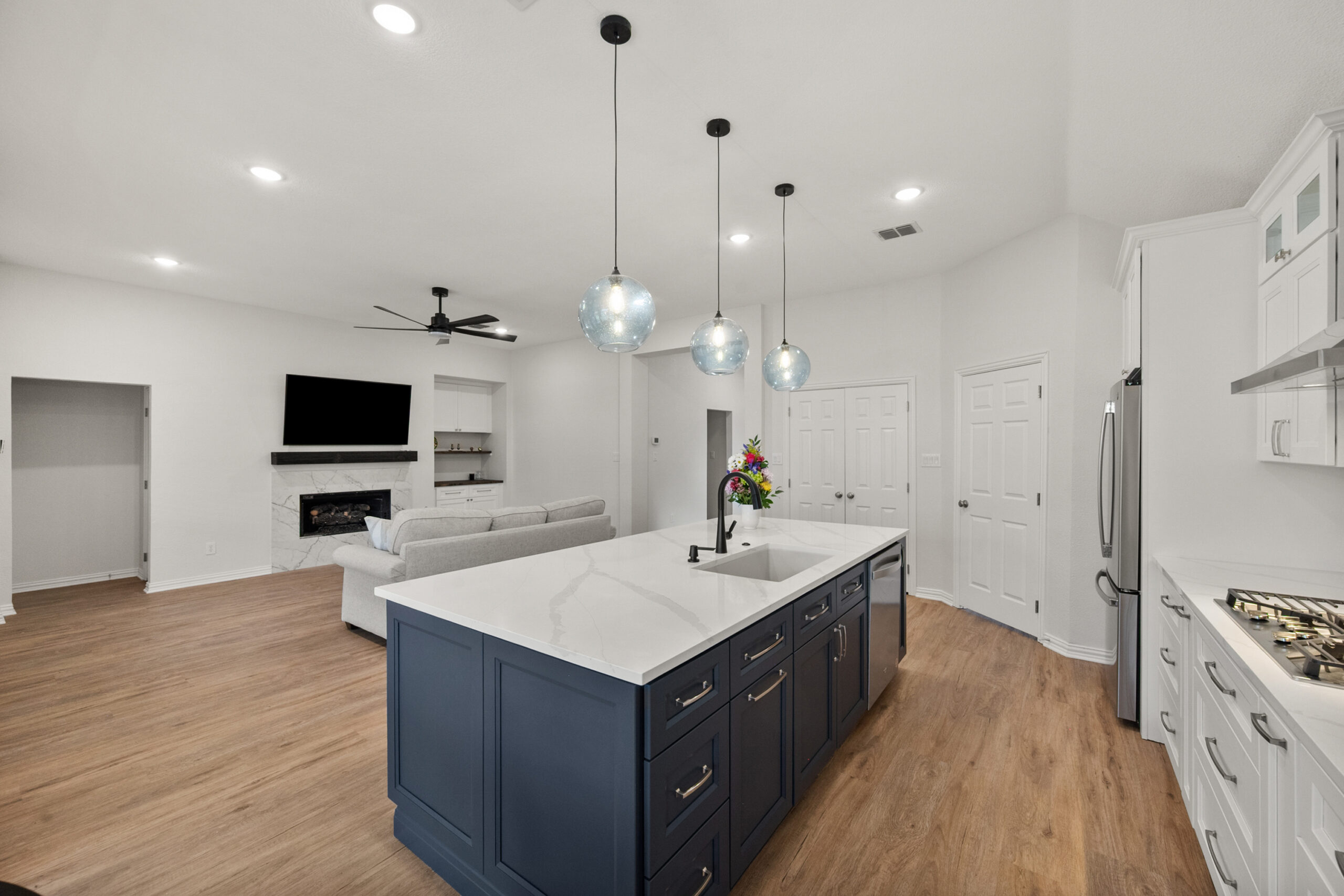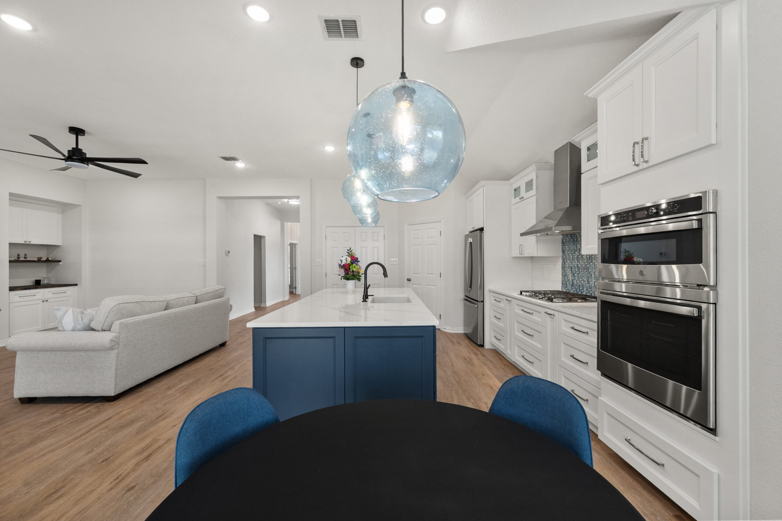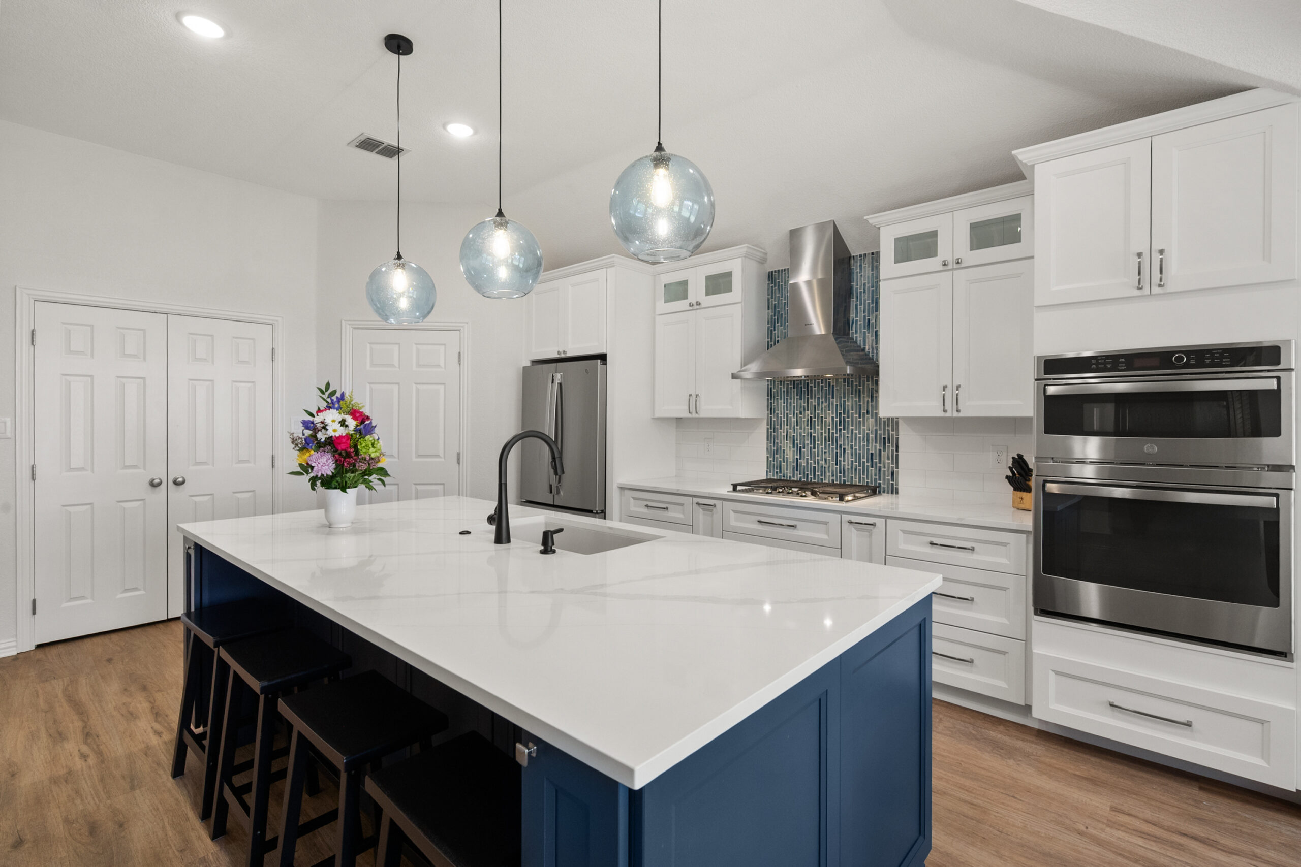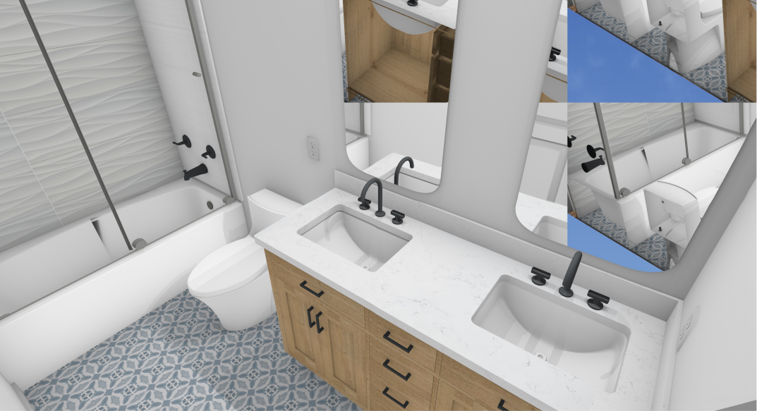 This comprehensive whole-house remodel showcases a sophisticated blend of modern functionality and transitional style. Led by the expert design team at Sunday Morning Kitchen and Bath, the project features a stunning kitchen anchored by a midnight blue waterfall island, professional-grade appliances, and custom mosaic accents. Two bathrooms were fully reimagined, highlighting a mix of warm oak textures, bold patterned tiling, and a luxury master suite complete with a freestanding soaking tub and frameless glass shower.