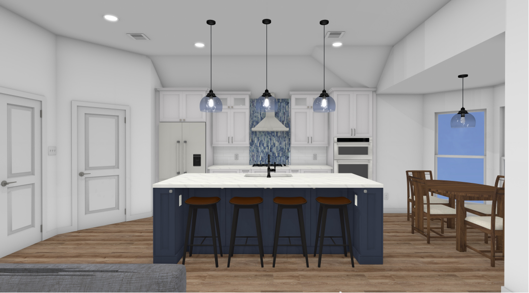 - Midnight Blue Kitchen Island: A bold statement piece with a white quartz waterfall edge and integrated seating.