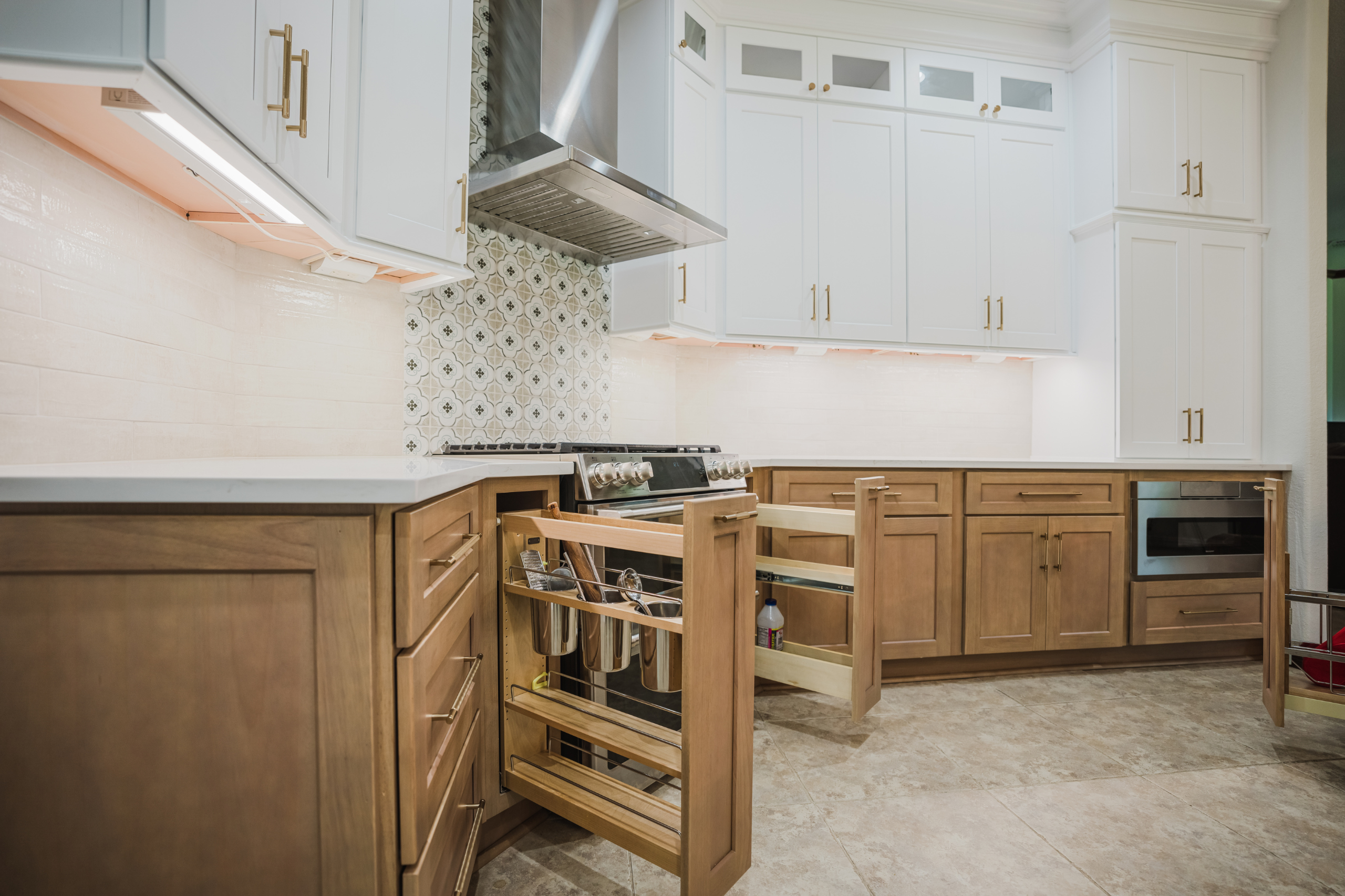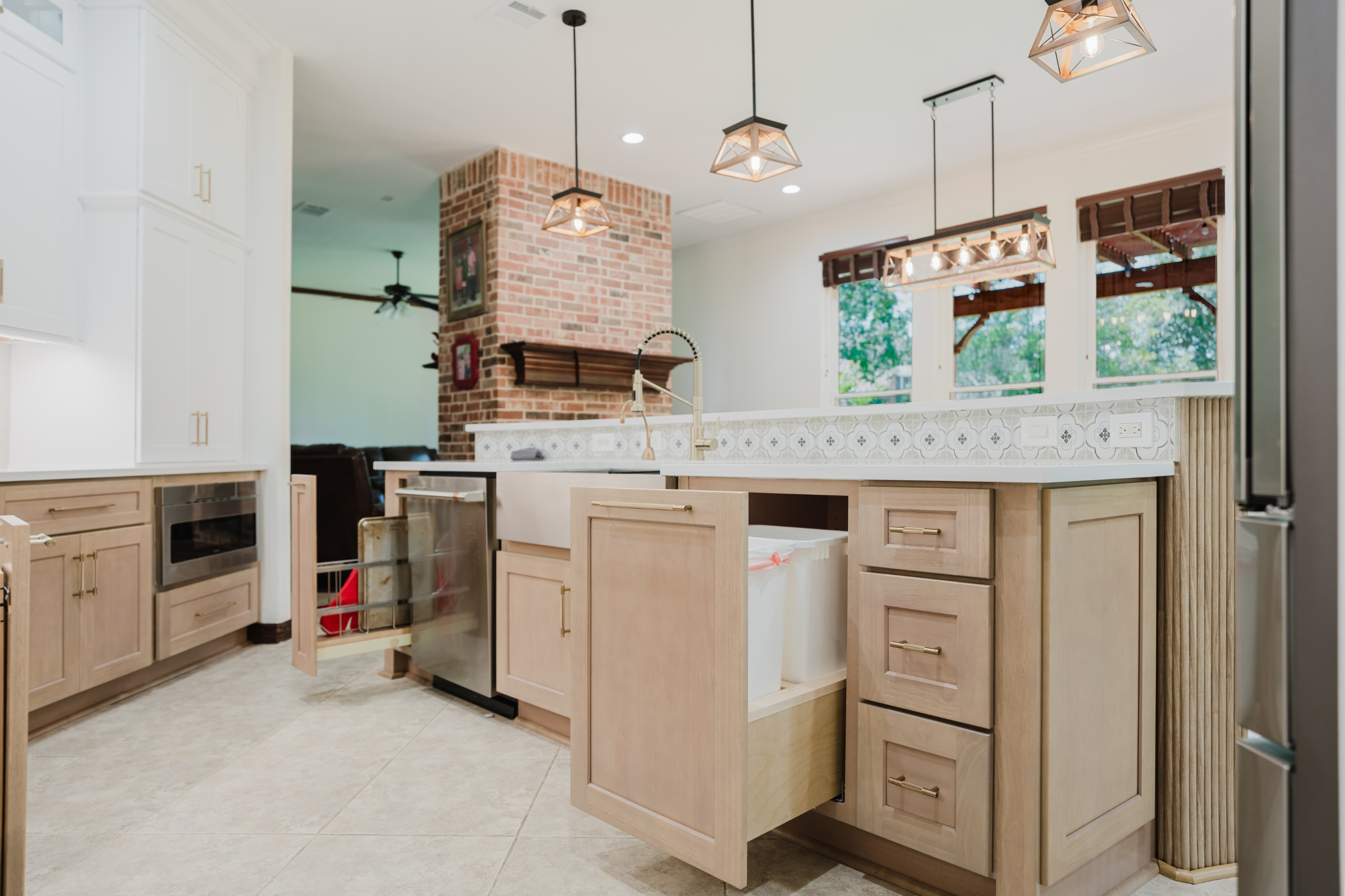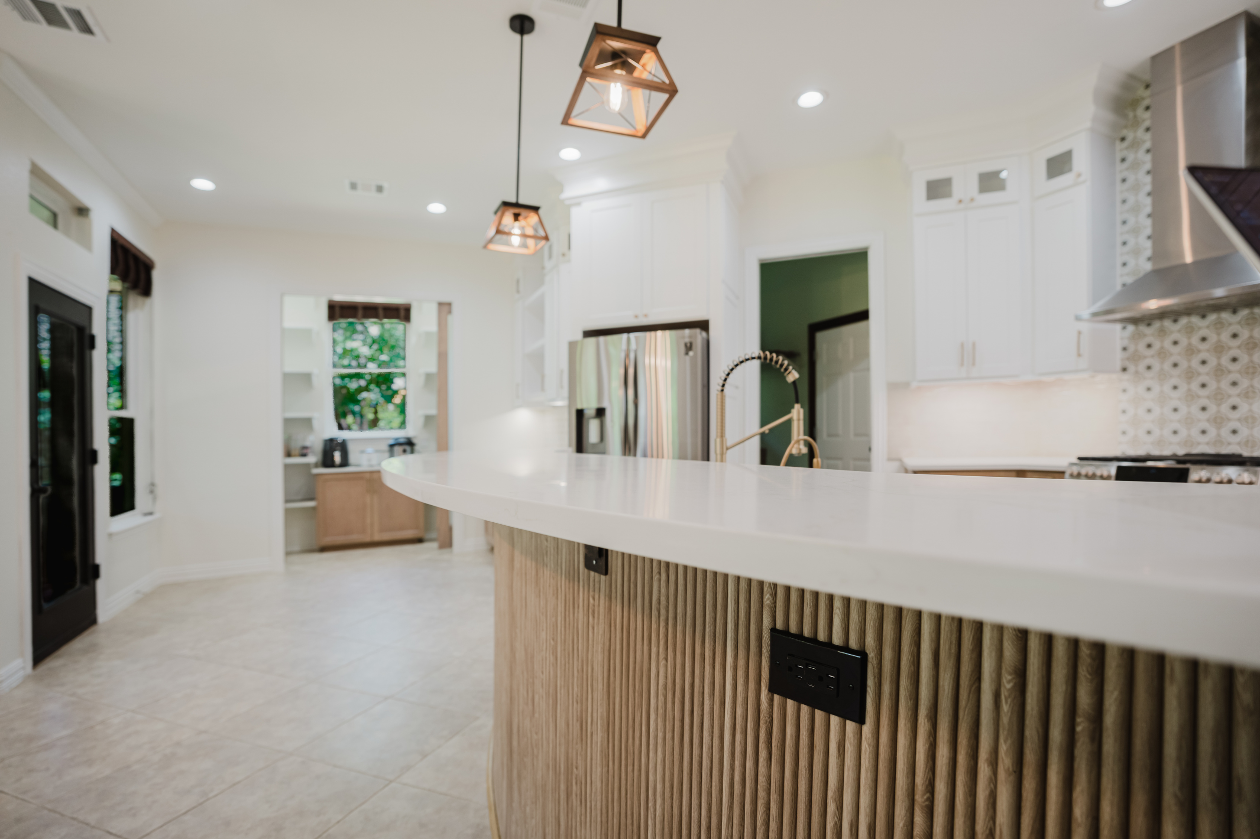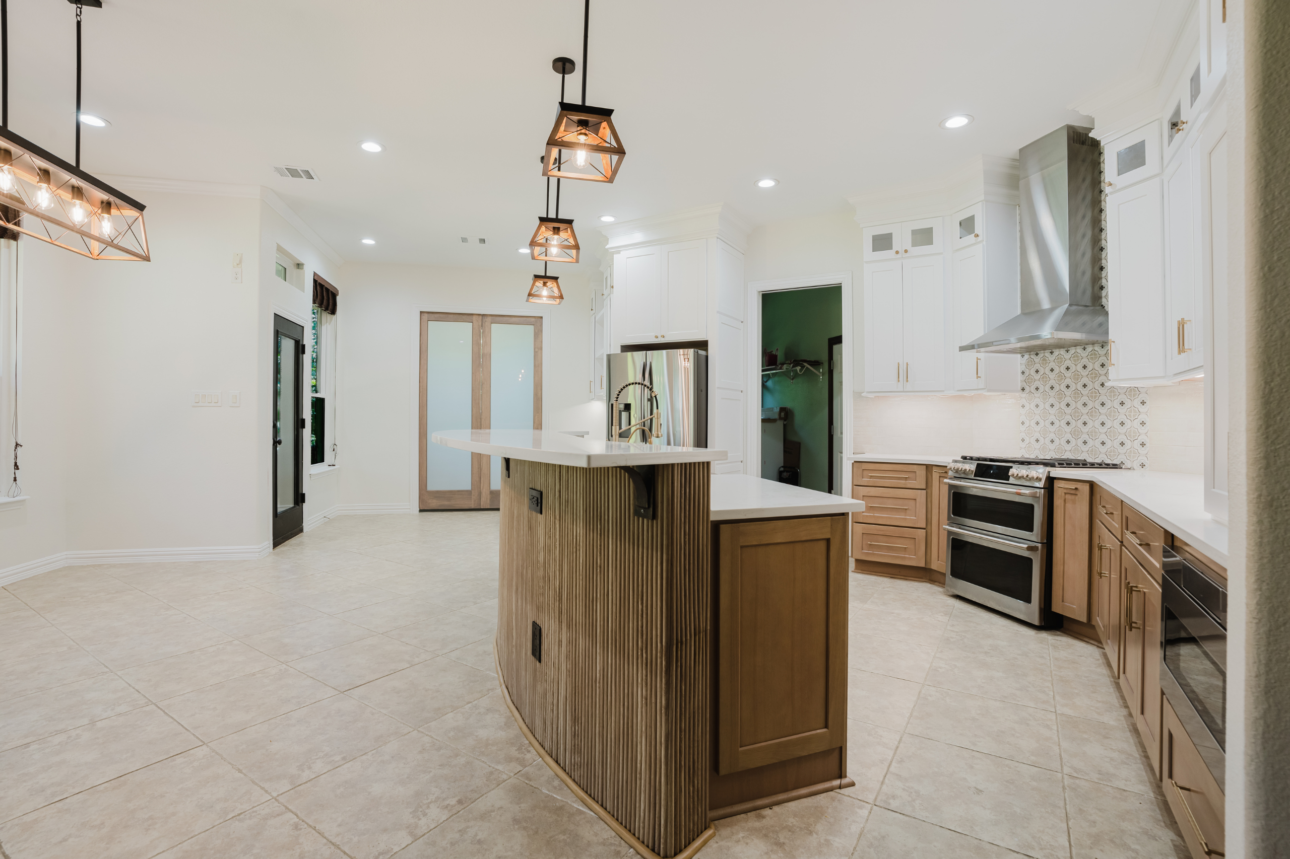 Guided by the homeowner’s vision for a bright, open, and highly functional space, this remodel transforms a heavy Mediterranean layout. Crisp white shaker cabinetry creates an airy backdrop, while a custom curved island with vertical white oak tambour panels adds warmth, texture, and sculptural movement. Every detail, from the integrated appliances to the architectural lighting, was intentionally selected to create the effortless “visual exhale” the homeowners desired.