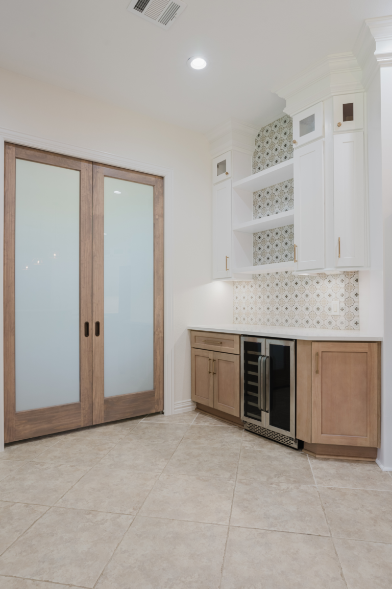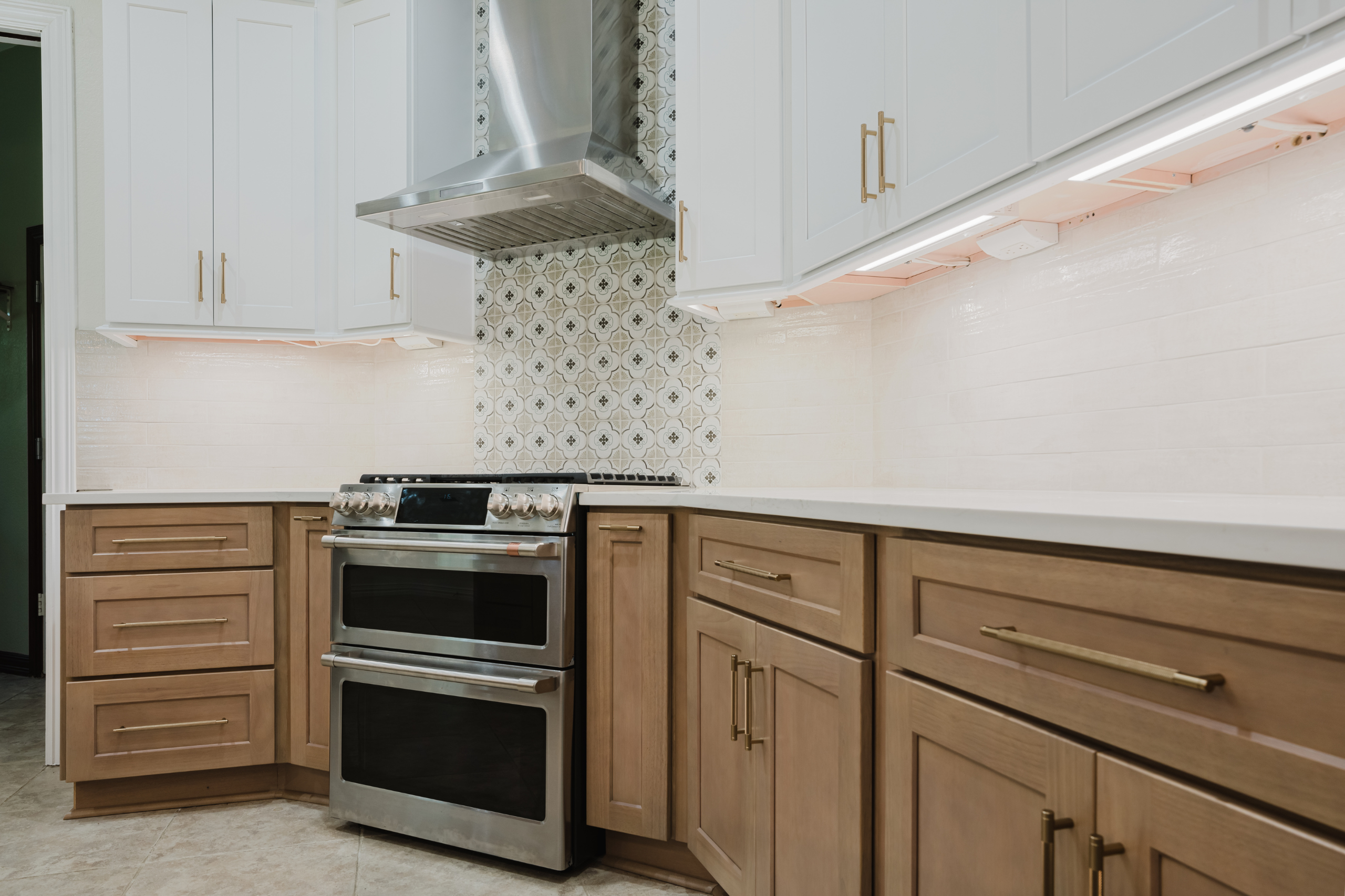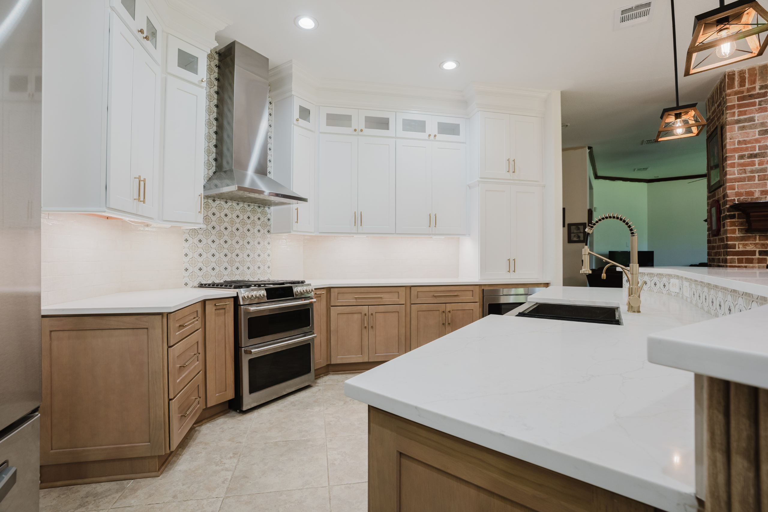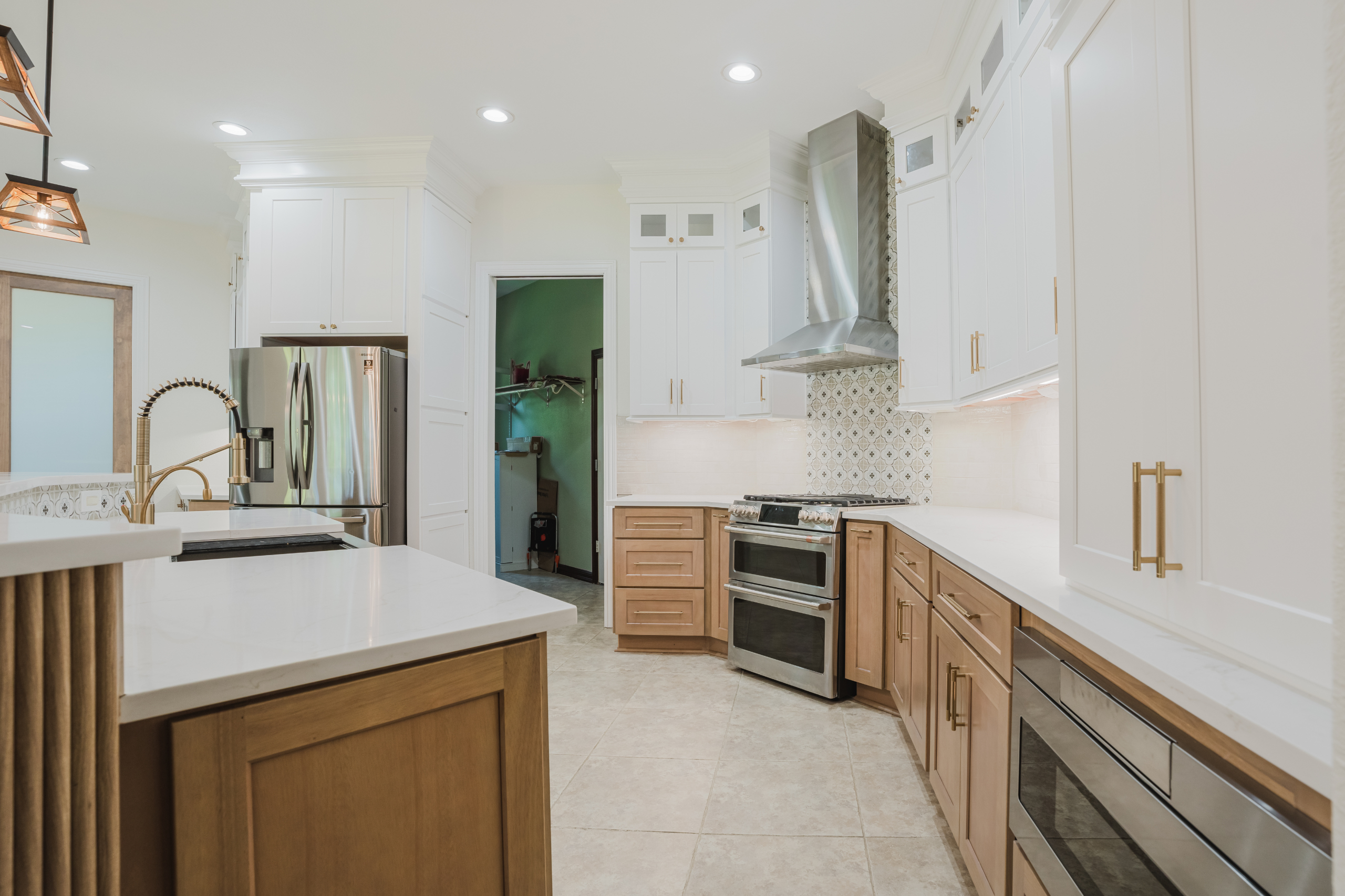 The cooking alcove serves as a sophisticated focal point, anchored by a stainless steel vent hood. It is framed by a floor-to-ceiling patterned tile inset. This tailored detail adds artisanal character while maintaining refined restraint. Perimeter cabinetry features pristine white quartz countertops extending seamlessly into the walk-in pantry. The result ensures durability, cohesion, and understated luxury throughout.