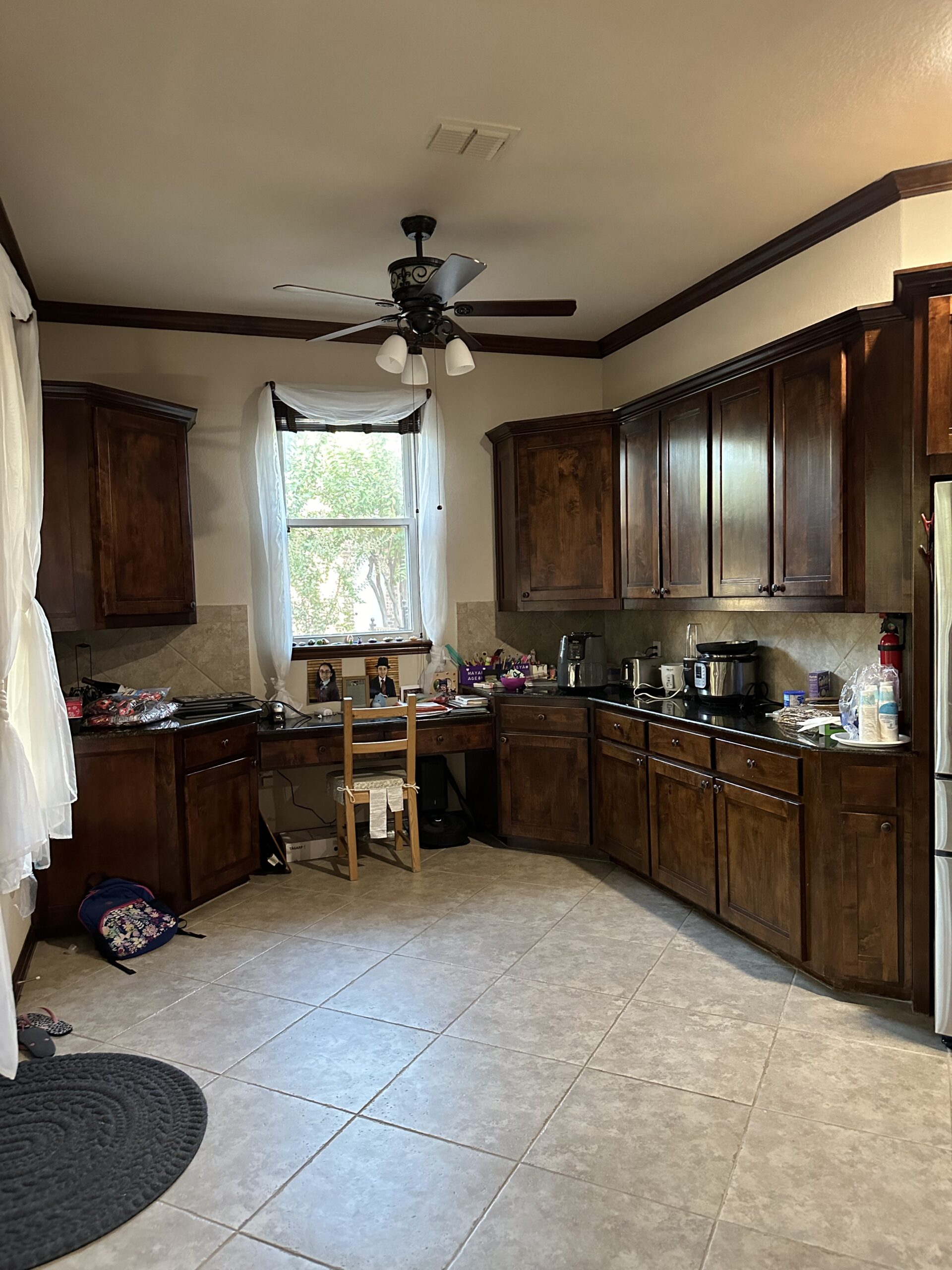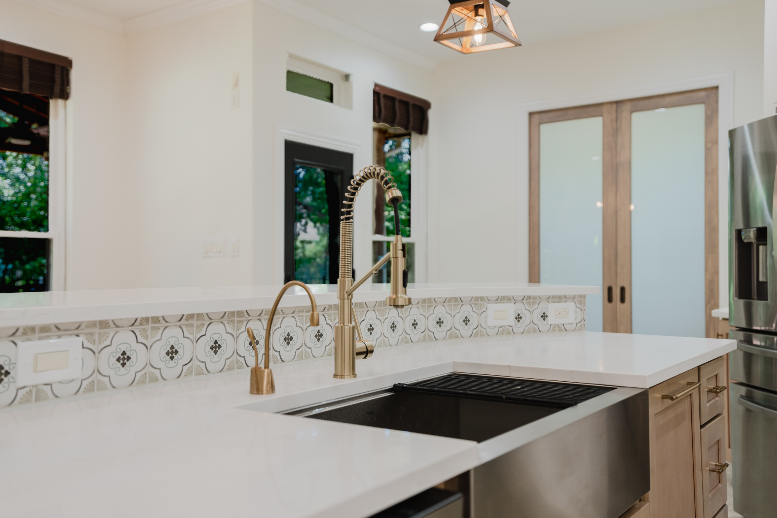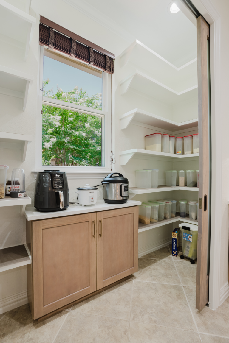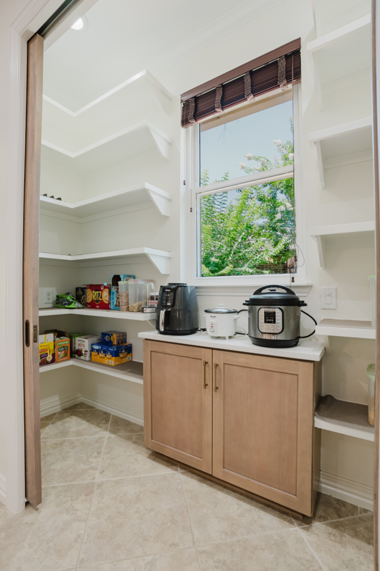 The cooking alcove serves as a sophisticated focal point, anchored by a stainless steel vent hood. It is framed by a floor-to-ceiling patterned tile inset. This tailored detail adds artisanal character while maintaining refined restraint. Perimeter cabinetry features pristine white quartz countertops extending seamlessly into the walk-in pantry. The result ensures durability, cohesion, and understated luxury throughout.
