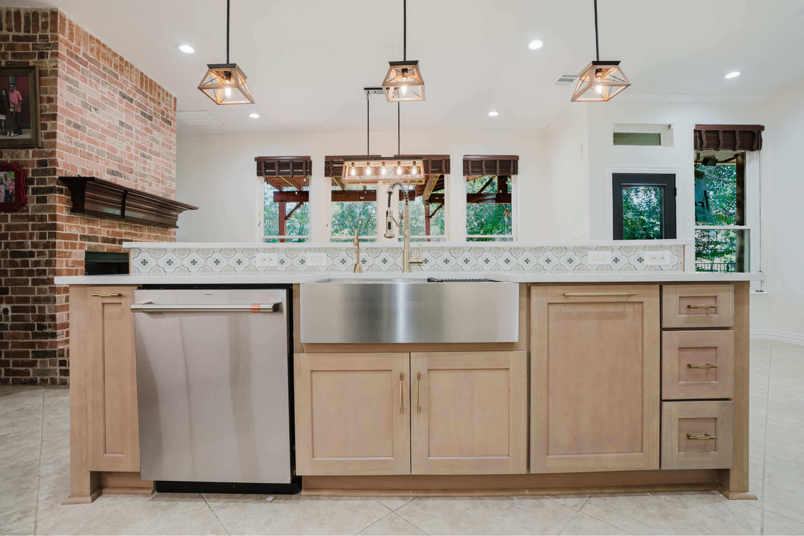 A bright white quartz countertop cascades along the island’s edge, offering generous prep space and luminous contrast to the natural wood below.