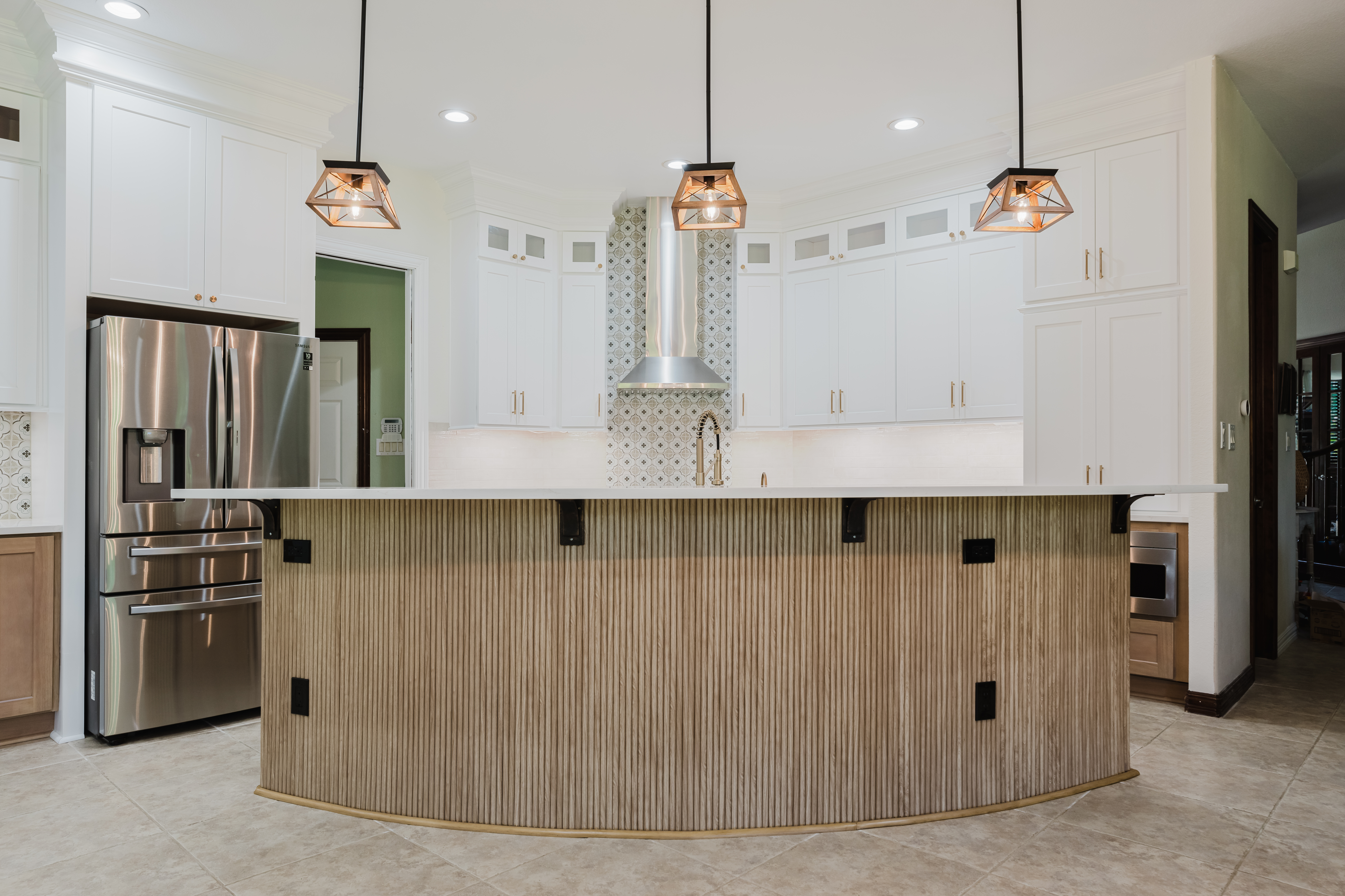 Guided by the homeowner’s vision for a bright, open, and highly functional space, this remodel transforms a heavy Mediterranean layout. Crisp white shaker cabinetry creates an airy backdrop, while a custom curved island with vertical white oak tambour panels adds warmth, texture, and sculptural movement. Every detail, from the integrated appliances to the architectural lighting, was intentionally selected to create the effortless “visual exhale” the homeowners desired.