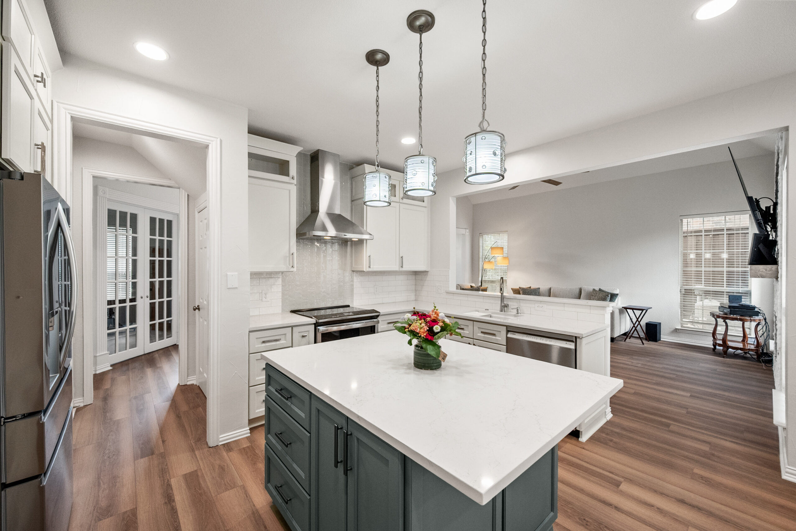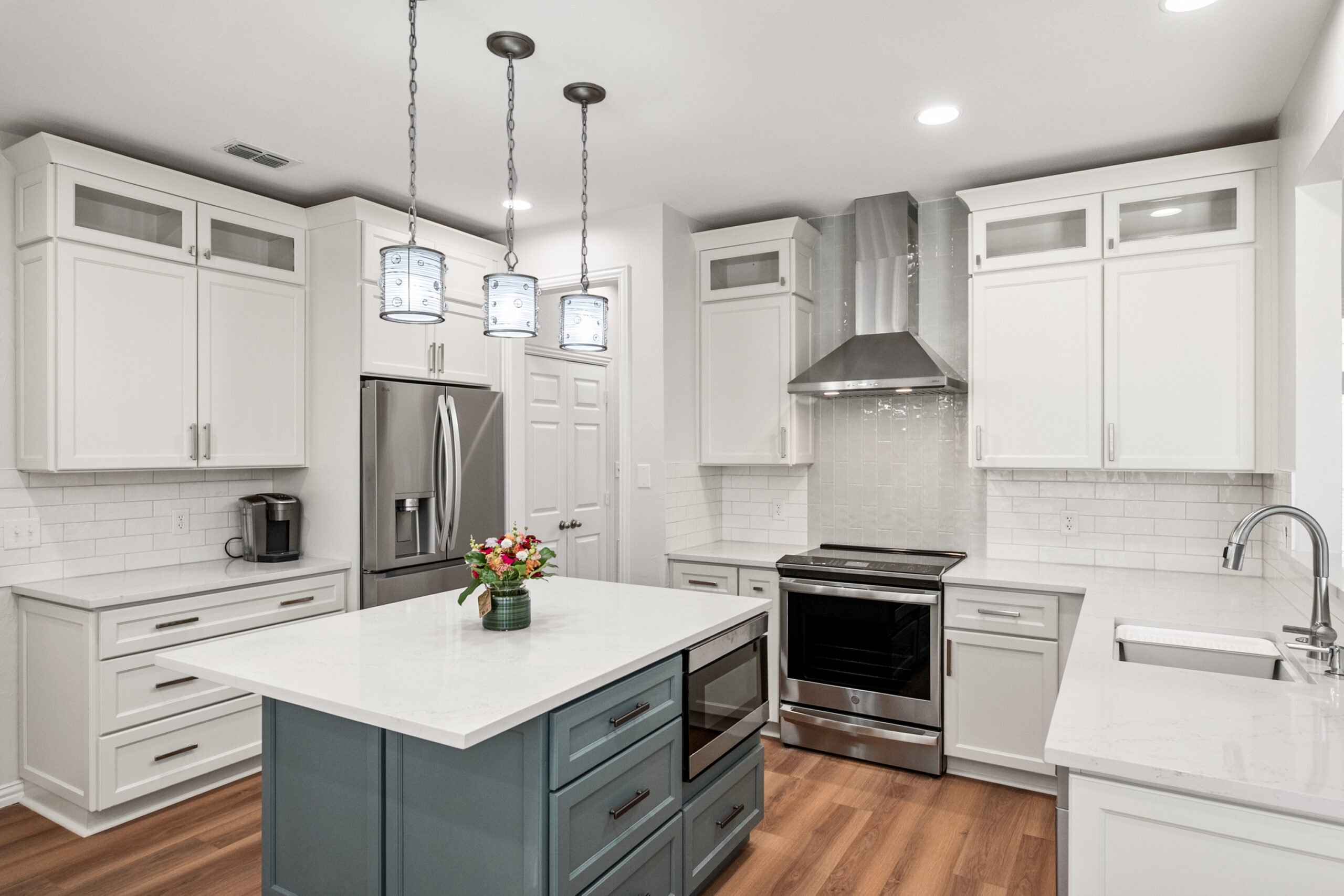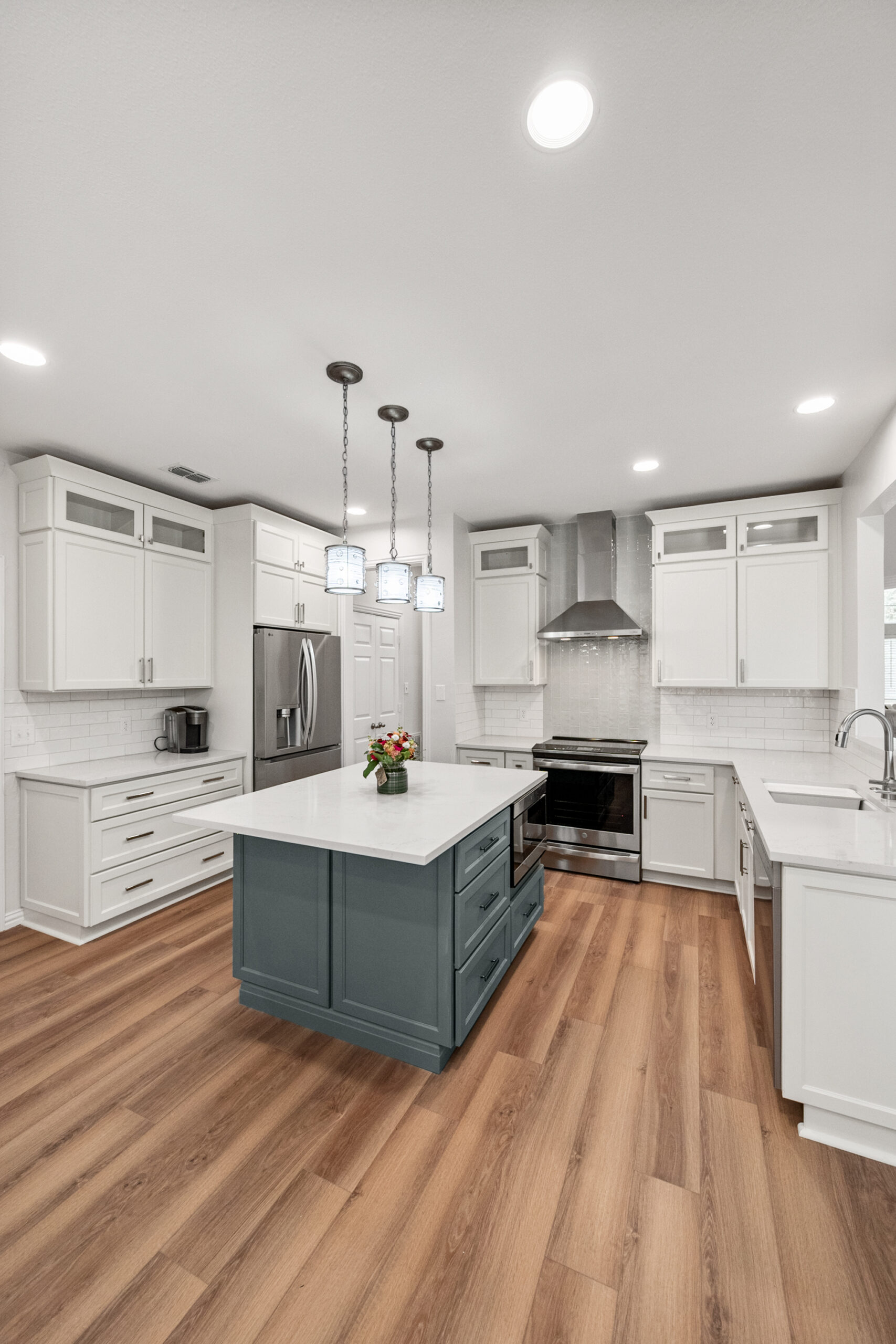 The focal point of this transformation is the bespoke custom island, finished in a rich slate-blue that acts as a sophisticated anchor to the crisp white perimeter cabinetry. The floor plan was meticulously engineered to enhance workflow, integrating a built-in microwave station and deep storage drawers directly into the island for a seamless, clutter-free look. Custom stacked cabinets with upper glass-front displays maximize the room’s verticality, while the textured subway tile backsplash and white quartz countertops catch the light to add depth. Every detail—from the sleek stainless steel vent hood to the warm wood-look flooring—was chosen to create a minimalist aesthetic that is as practical for meal prep as it is for high-end entertaining.