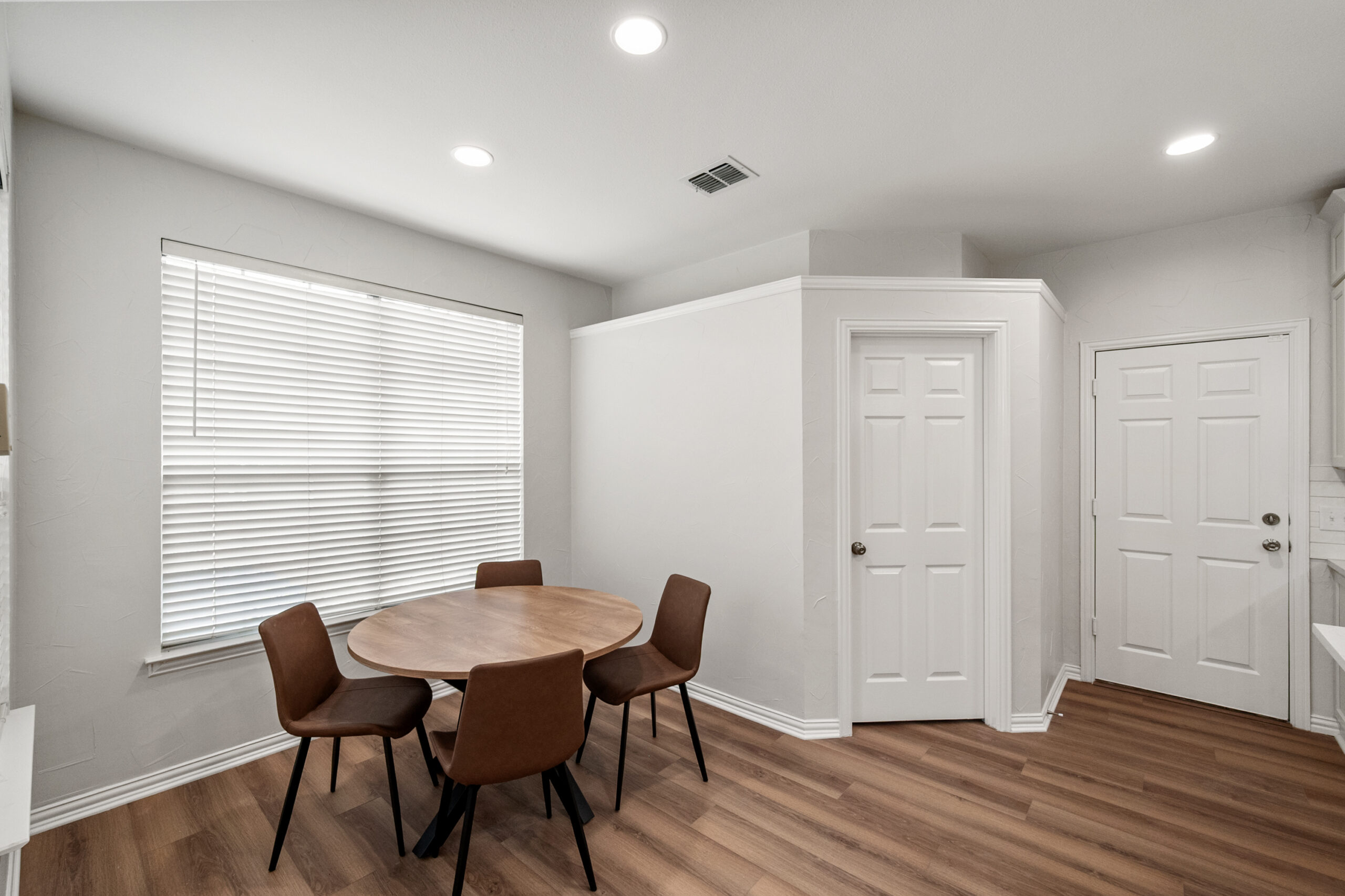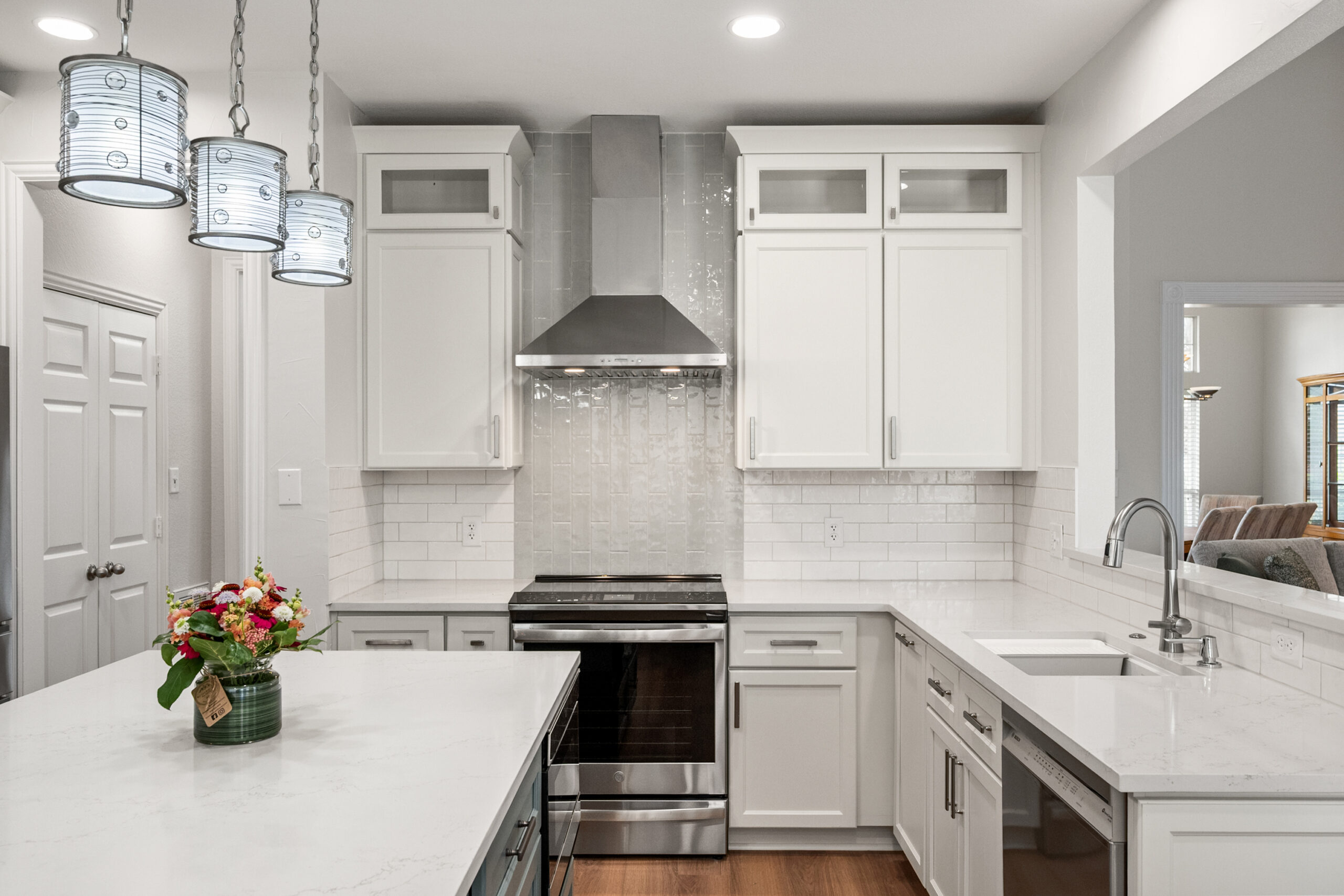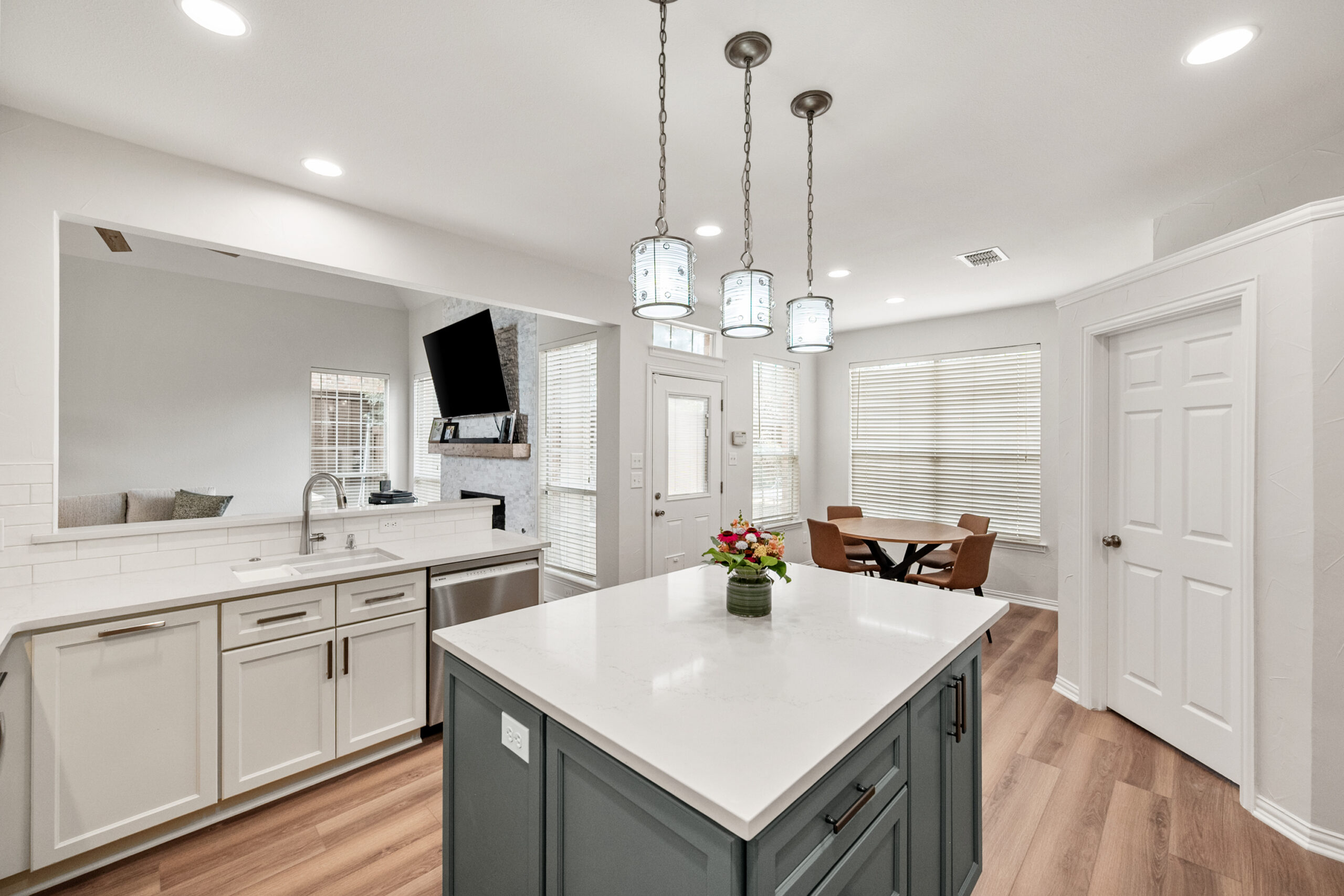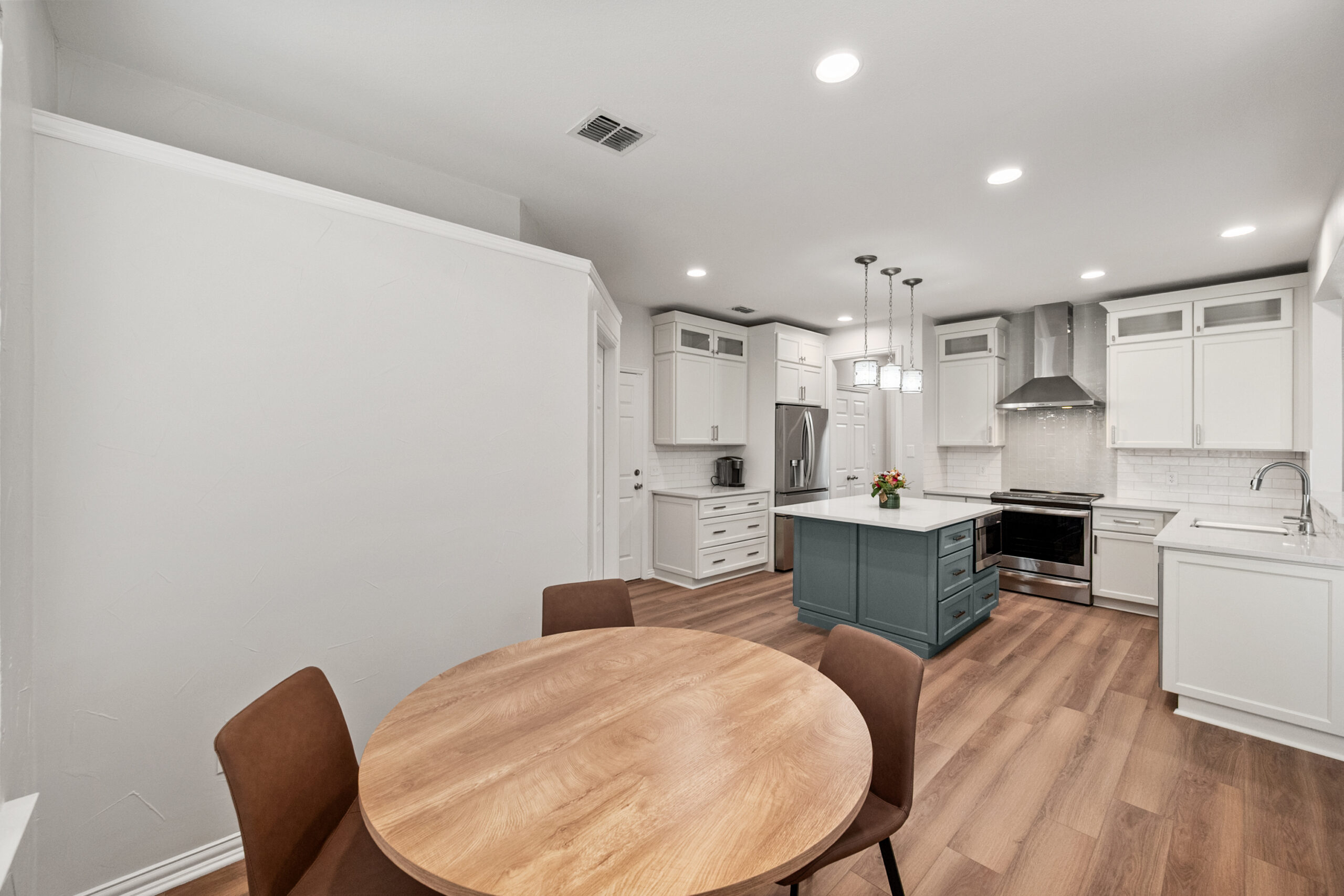 The focal point of this transformation is the bespoke custom island, finished in a rich slate-blue that acts as a sophisticated anchor to the crisp white perimeter cabinetry. The floor plan was meticulously engineered to enhance workflow, integrating a built-in microwave station and deep storage drawers directly into the island for a seamless, clutter-free look. Custom stacked cabinets with upper glass-front displays maximize the room’s verticality, while the textured subway tile backsplash and white quartz countertops catch the light to add depth. Every detail—from the sleek stainless steel vent hood to the warm wood-look flooring—was chosen to create a minimalist aesthetic that is as practical for meal prep as it is for high-end entertaining.
