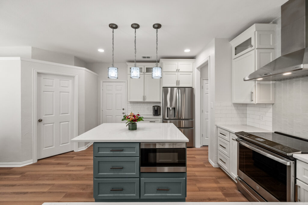 The focal point of this transformation is the bespoke custom island, finished in a rich slate-blue that acts as a sophisticated anchor to the crisp white perimeter cabinetry. The floor plan was meticulously engineered to enhance workflow, integrating a built-in microwave station and deep storage drawers directly into the island for a seamless, clutter-free look. Custom stacked cabinets with upper glass-front displays maximize the room’s verticality, while the textured subway tile backsplash and white quartz countertops catch the light to add depth. Every detail—from the sleek stainless steel vent hood to the warm wood-look flooring—was chosen to create a minimalist aesthetic that is as practical for meal prep as it is for high-end entertaining.