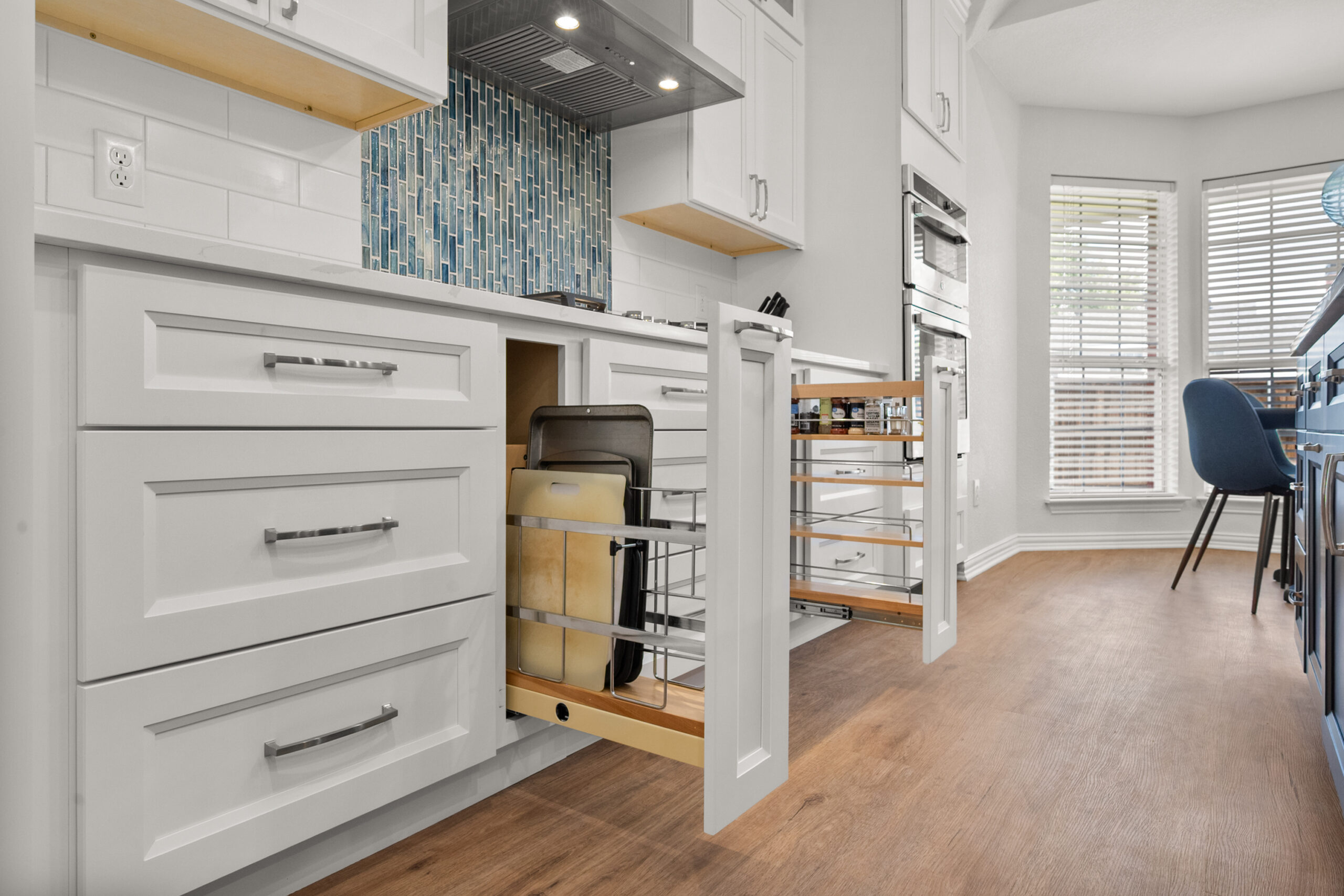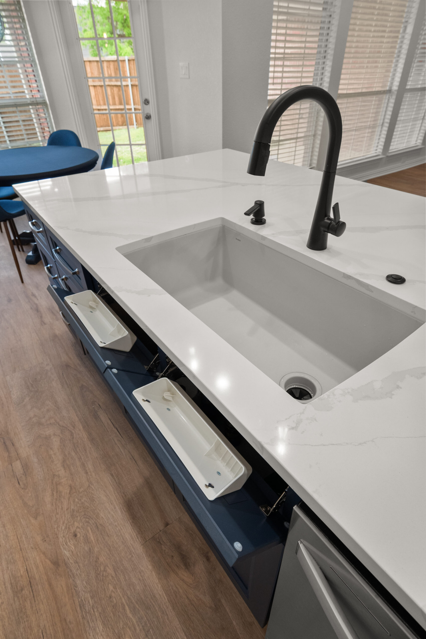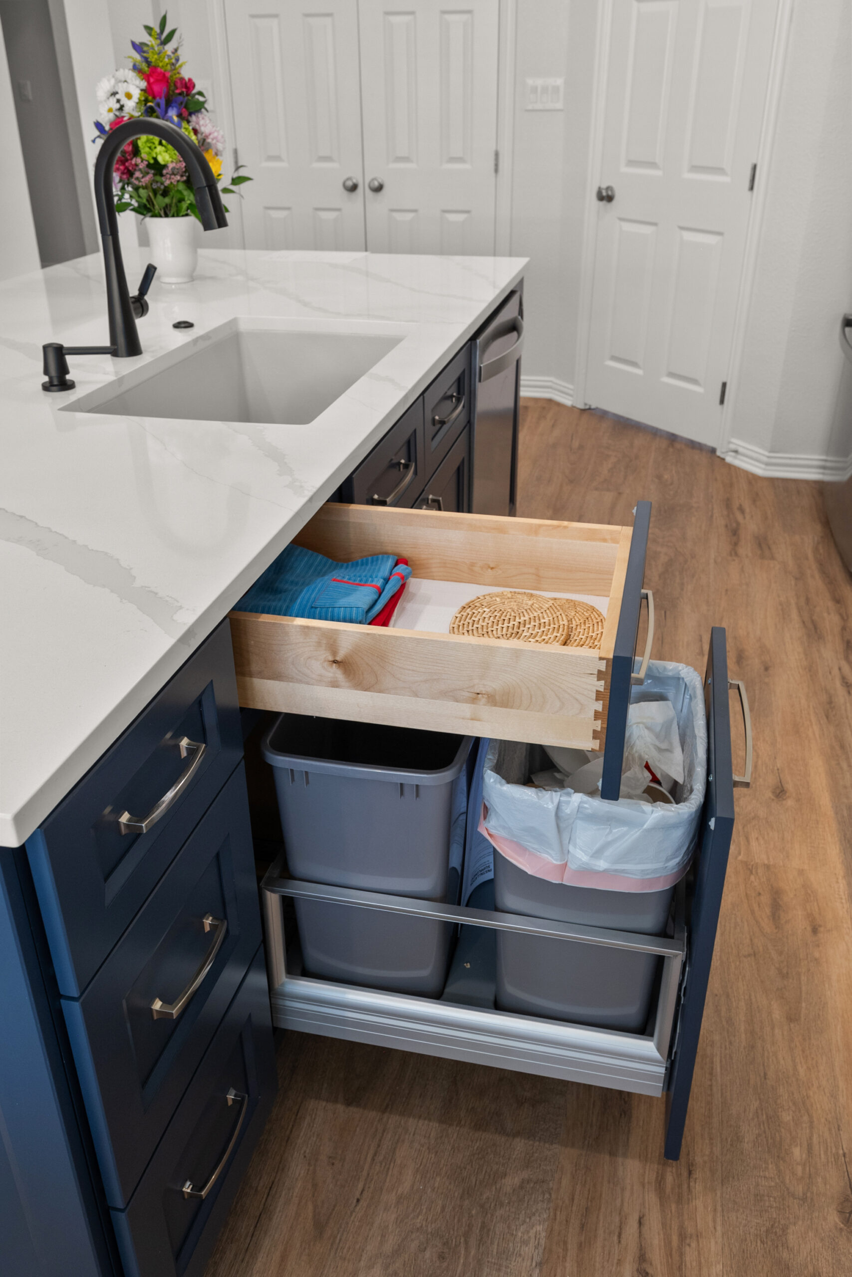 High-function cabinetry including dual-bin trash pull-outs, hidden sink trays, and vertical baking sheet organizers.