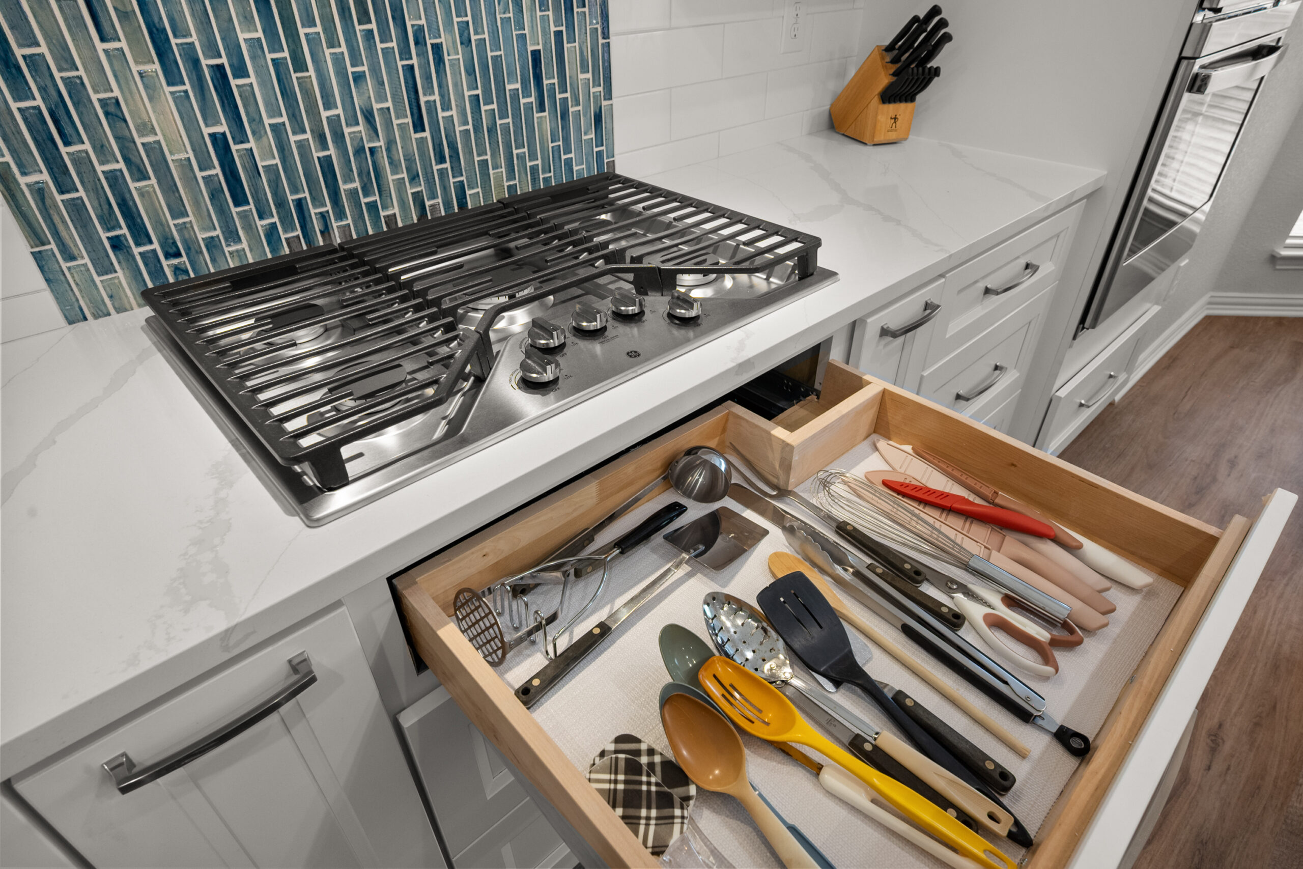A striking vertical blue linear mosaic tile that serves as a designer centerpiece behind the cooktop.