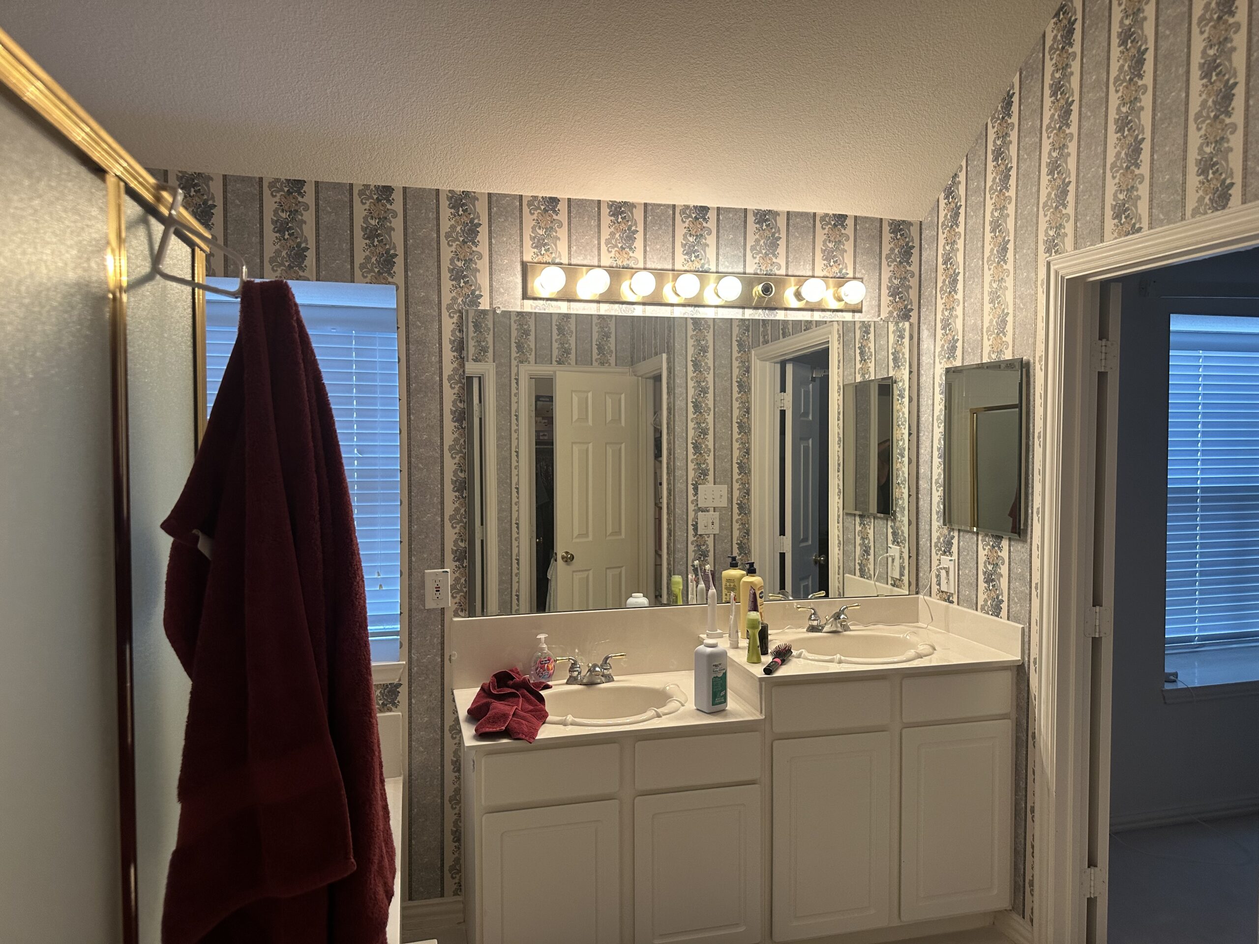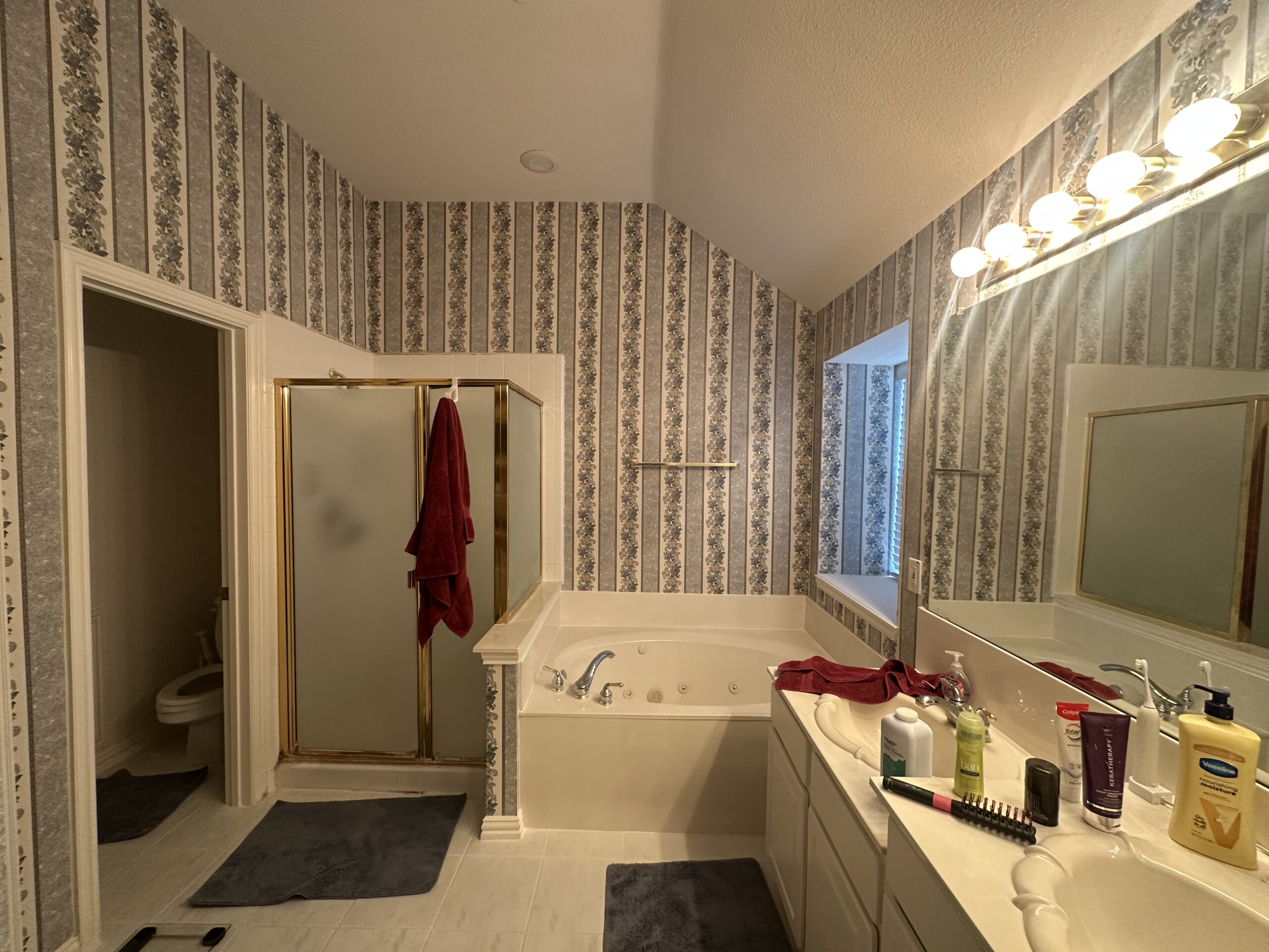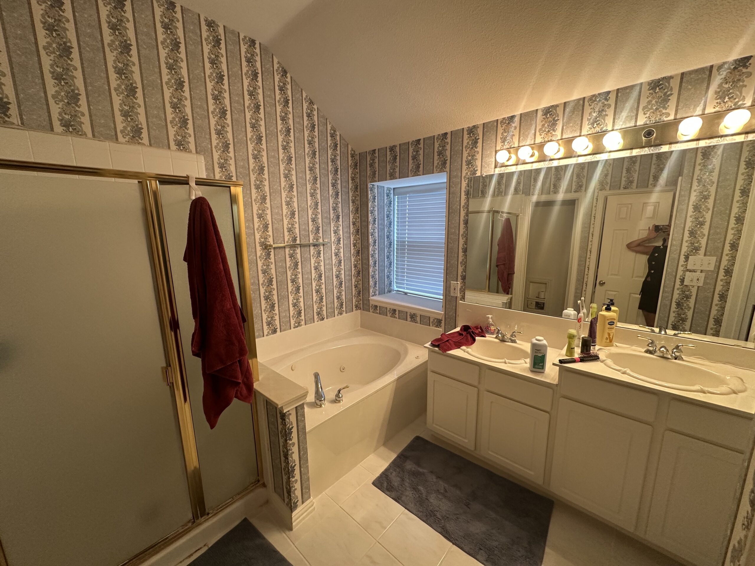This complete master bath overhaul transforms a dated room into a luxurious, spa-inspired Modern Transitional retreat. The design language is high-contrast and sophisticated, defined by a bold, super dark navy blue double vanity accented with elegant champagne gold hardware. A large frameless glass walk-in shower is the clear focal point, featuring bright marble-look porcelain walls, a custom-built corner bench, and intricate blue herringbone mosaic tile on both the floor and the recessed niche. A dedicated freestanding soaking tub provides a serene corner for relaxation. With large-format gray floor tiles and a vaulted ceiling creating an open, airy feel, every element—from the textured glass vanity sconces to the curated mixed metals—was meticulously selected to create a unified, high-end sanctuary.