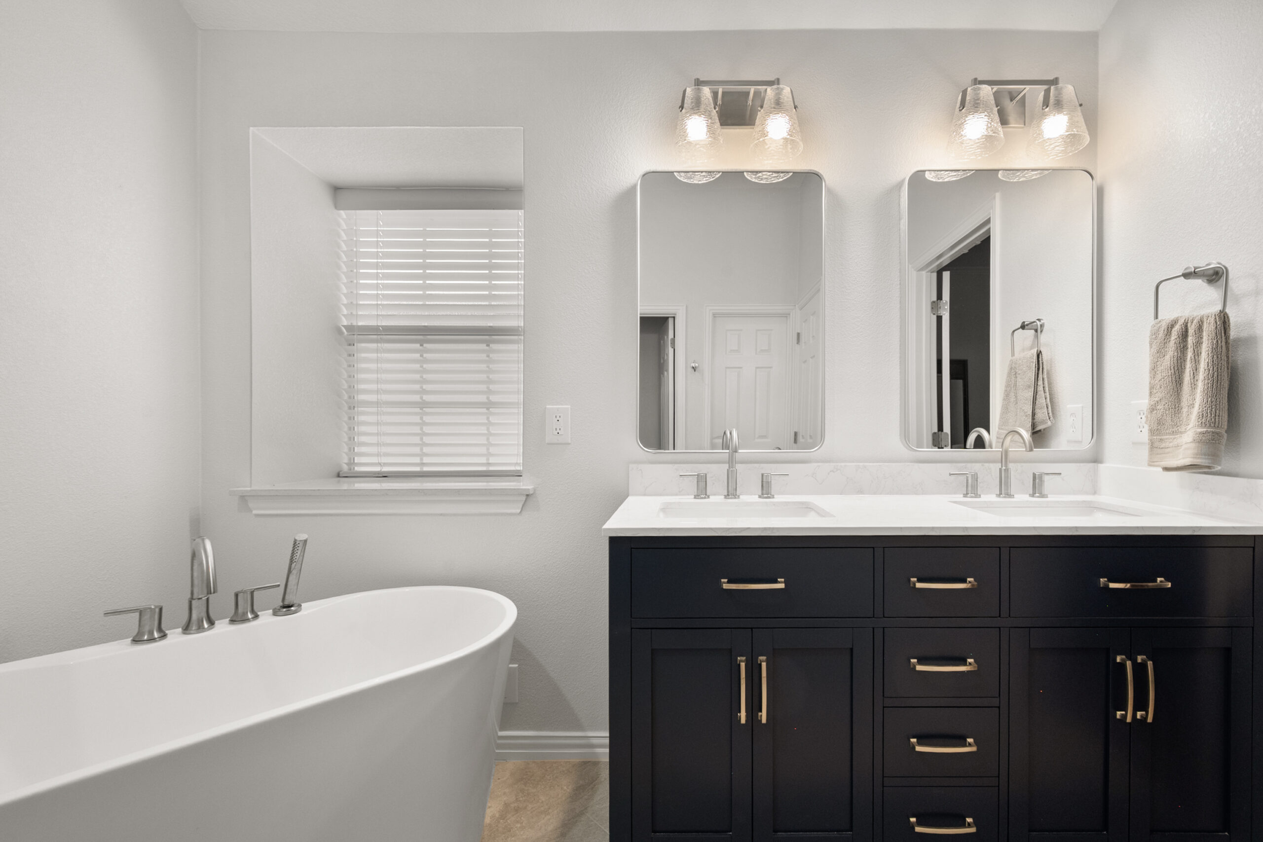 Modern Transitional Primary Bath with High-Contrast Navy and Gold Vanity