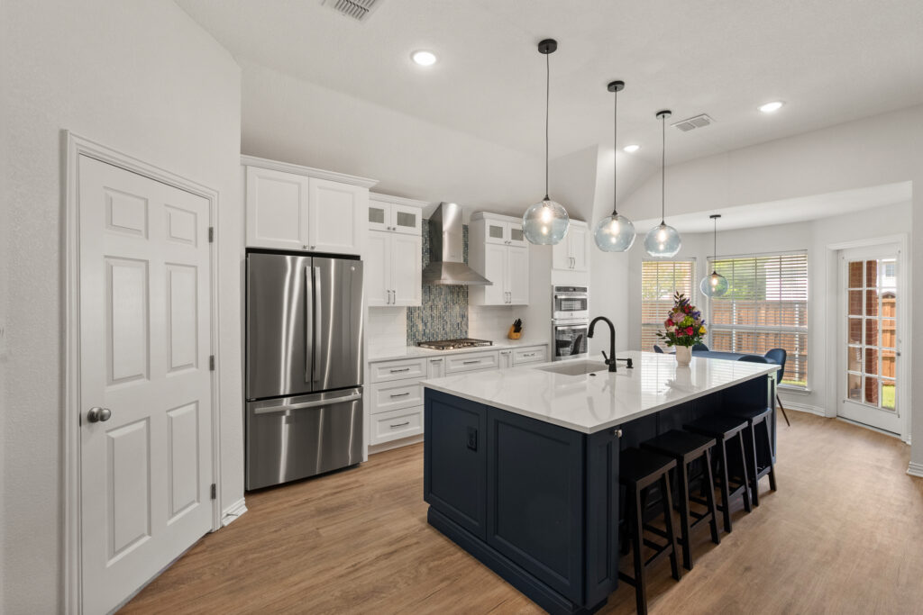 In this customer’s case, we ultimately decided to remove a load-bearing wall in the kitchen to open it up and reduce that boxed-in feeling. We also went with lighter paint tones (she loved bright whites, grays, and blues) to achieve a more modern look.