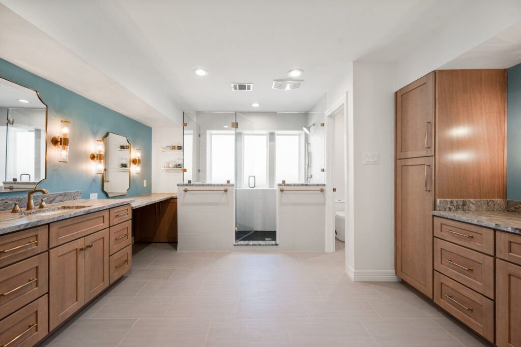Large-format tile with reduced grout lines for the primary bathroom